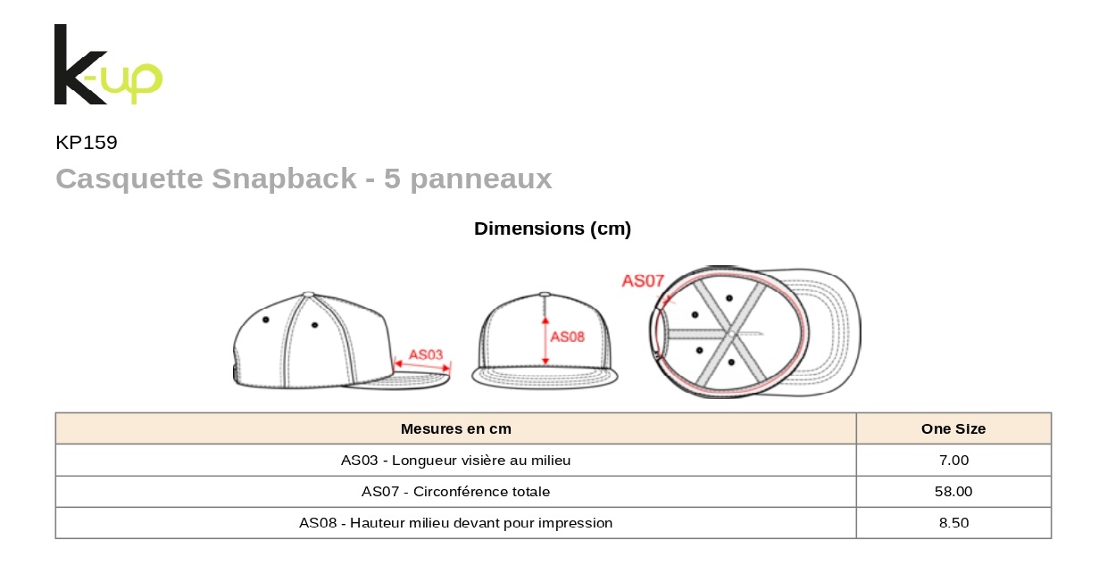 100% polyester. Casquette Snapback 5 panneaux. Visière droite et profil haut. Dotée d'une languette de réglage en plastique.